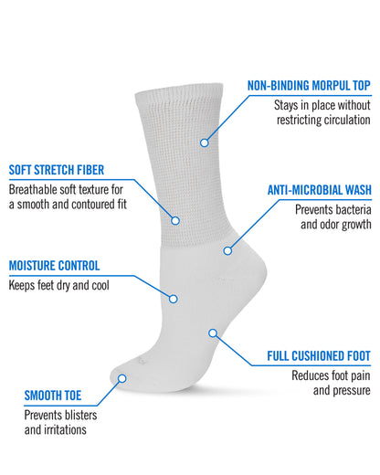 Say bye-bye to blisters, and hello to our Diabetic Full Cushion Crew Socks. These diabetic crews have been designed to provide the ultimate all day relief; ideal for those with diabetes, circulatory issues, neuropathy, and edema. Created with comfort in mind, their soft stretch fibers are breathable and soft for a smooth and contoured fit, with a non-binding morpul top that has a loose weave design and allows for a form-fitting feel without any harsh restriction. Featuring a full cushioned foot to reduce pressure, and a smooth, seamless toe for a no bump, no pain wear. You know what this means don't you? Less pressure, more circulation, and happier, healthier legs!