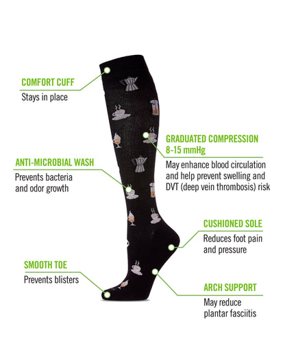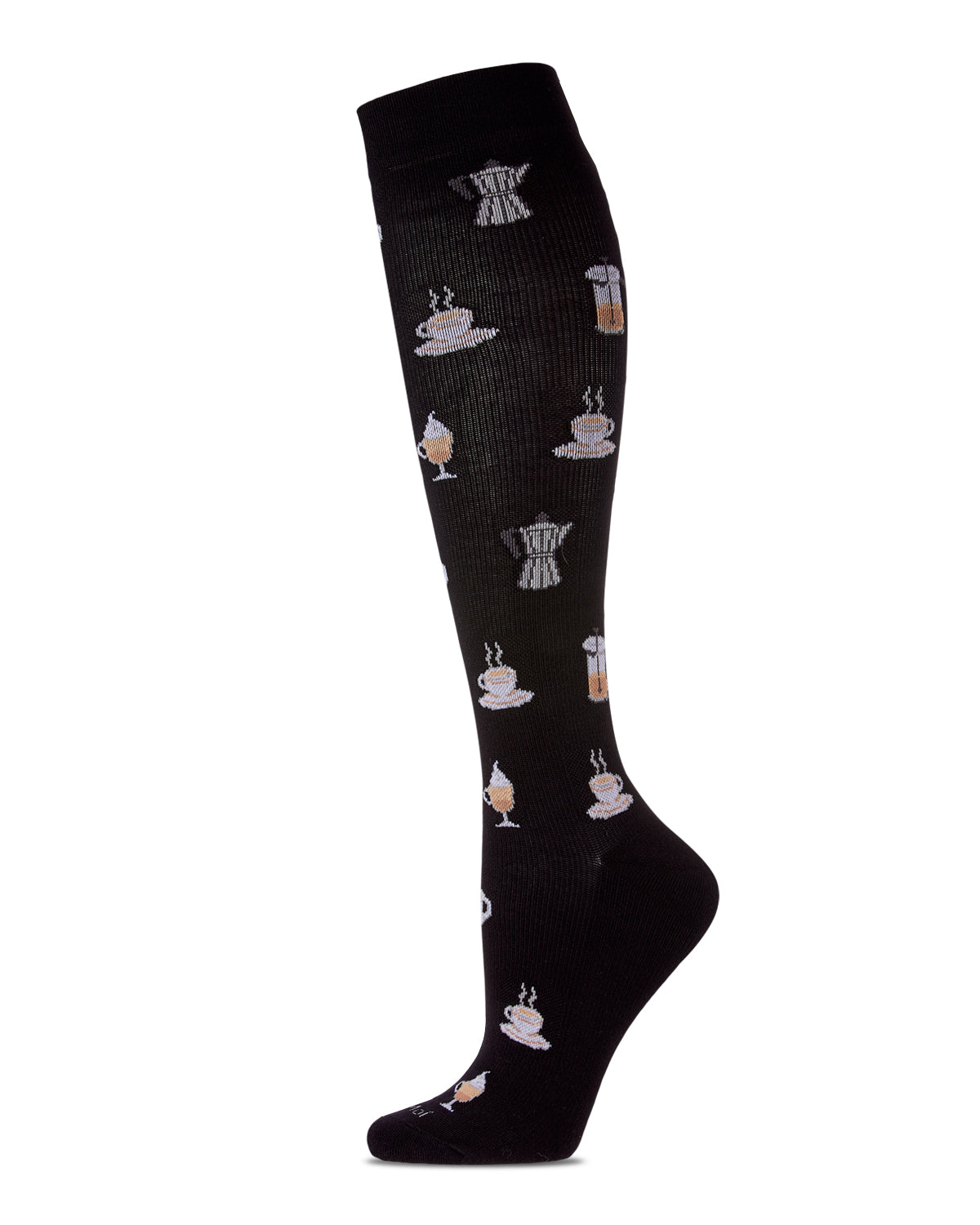 Energize your step in our Bon Café Bamboo Blend Compression Socks. Created with moderate and graduated compression, so they're not too tight, but just snug enough to give you that extra support you need. Compression socks are great for busy travelers, active athletes, and long days at the office. Featuring a comfort cuff to provide smooth support and a non-slip fit, with anti-microbial properties that fight against foot odor. The smooth and seamless toe prevents irritation, and the added cushioned sole reduces pain and pressure so you can take a load off. The stretchy knit nylon feels weightless and will keep you cool and comfortable for all day wear. Healthy blood flow and swelling reduction might not be all that glamorous, but you might as well do it in style.