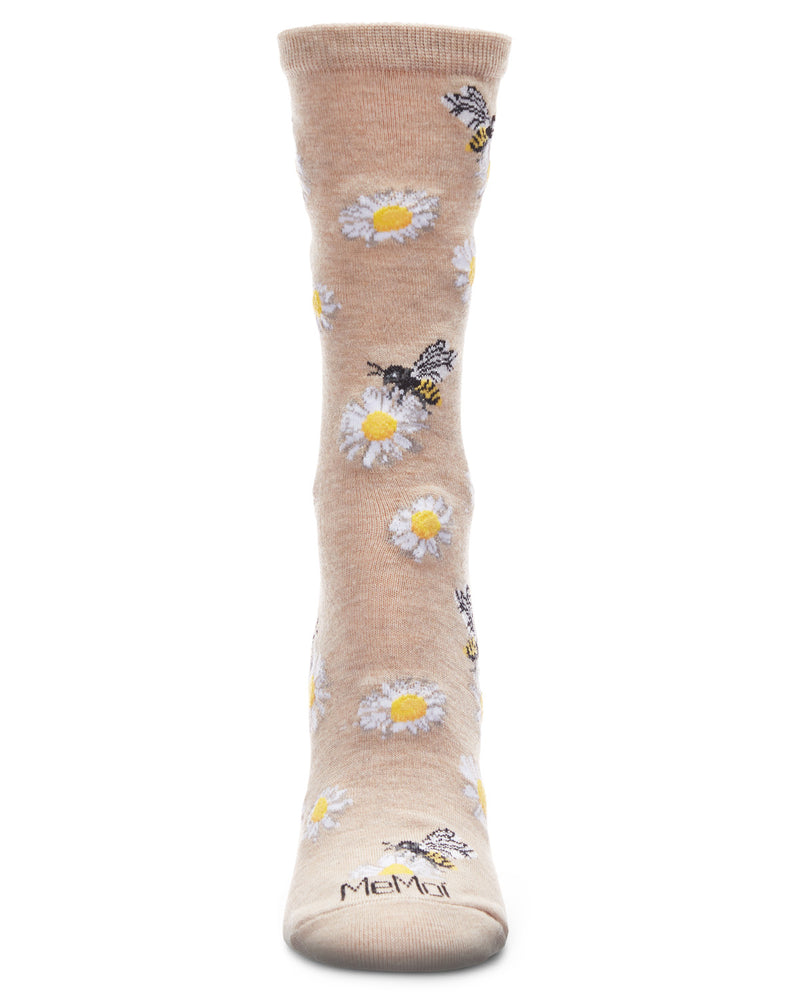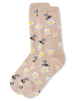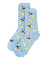Bees: they're great for the planet, and even better for your socks. Our Daisy Bees Bamboo Blend Crew Socks feature a print of sweet, cute little bumblebees visiting daisies on a dreamy light blue background, reminiscent of the daytime sky. This design is a breath of fresh air for your wardrobe and your feet.
