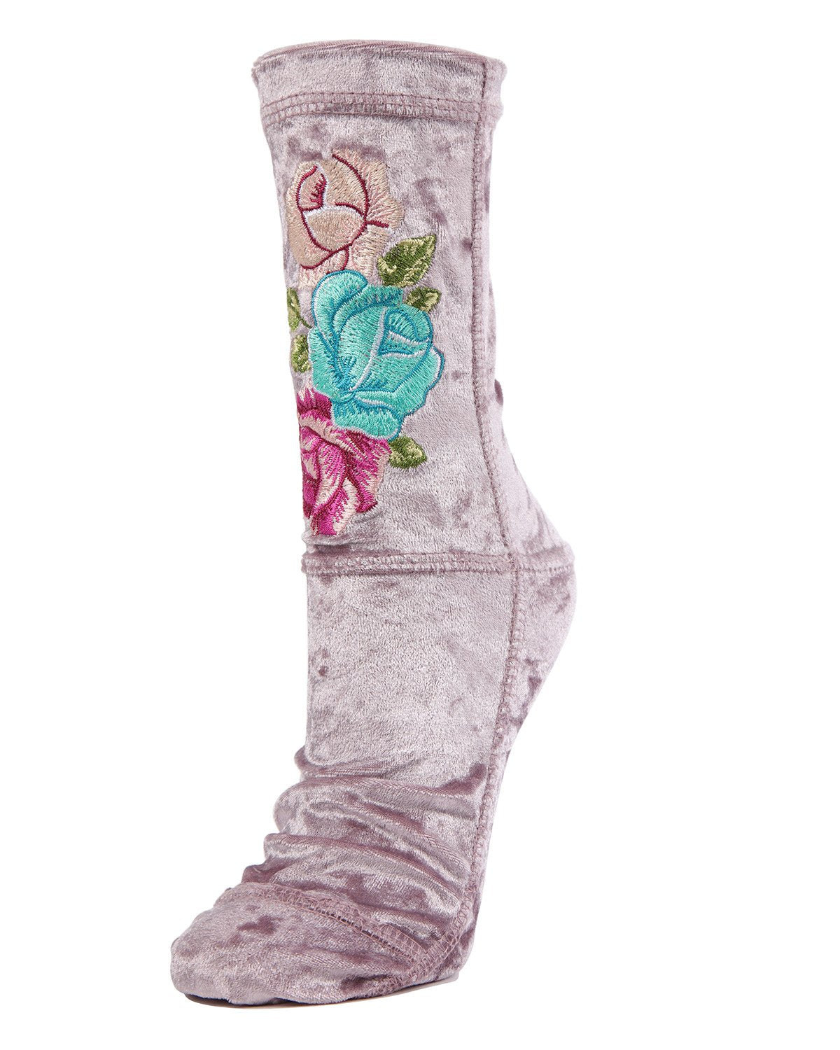 Get the look of luxe velvet without the bulk. MeMoi Floral Embroidered Crushed Velvet Crew socks are thin enough to shimmy into sneakers, flats and boots while delivering the lushness promised by a beautiful layer of velvet. Embroidered blue, pink and purple roses on the leg add another layer of luxurious detail to an already-charming pair.