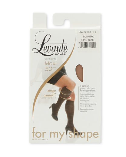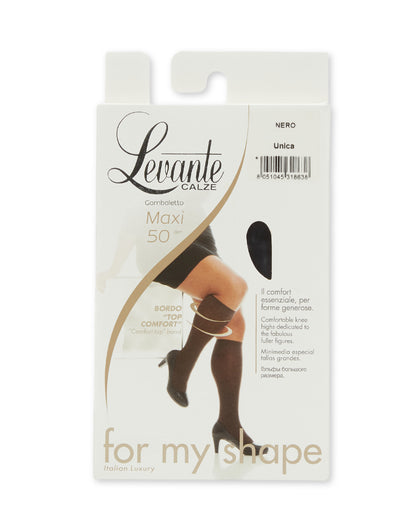 Levante's Maxi 50 opaque knee highs are roomy for larger calves without constriction or discomfort. The thick comfort band won't irritate, while the shadow toe is reinforced for plenty of toe-wiggling. Each package comes with two pairs.