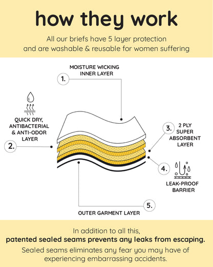 - Moisture wicking inner layer, antibacterial and anti-odor layers, and a leak proof barrier for leak-free all-day security