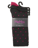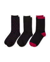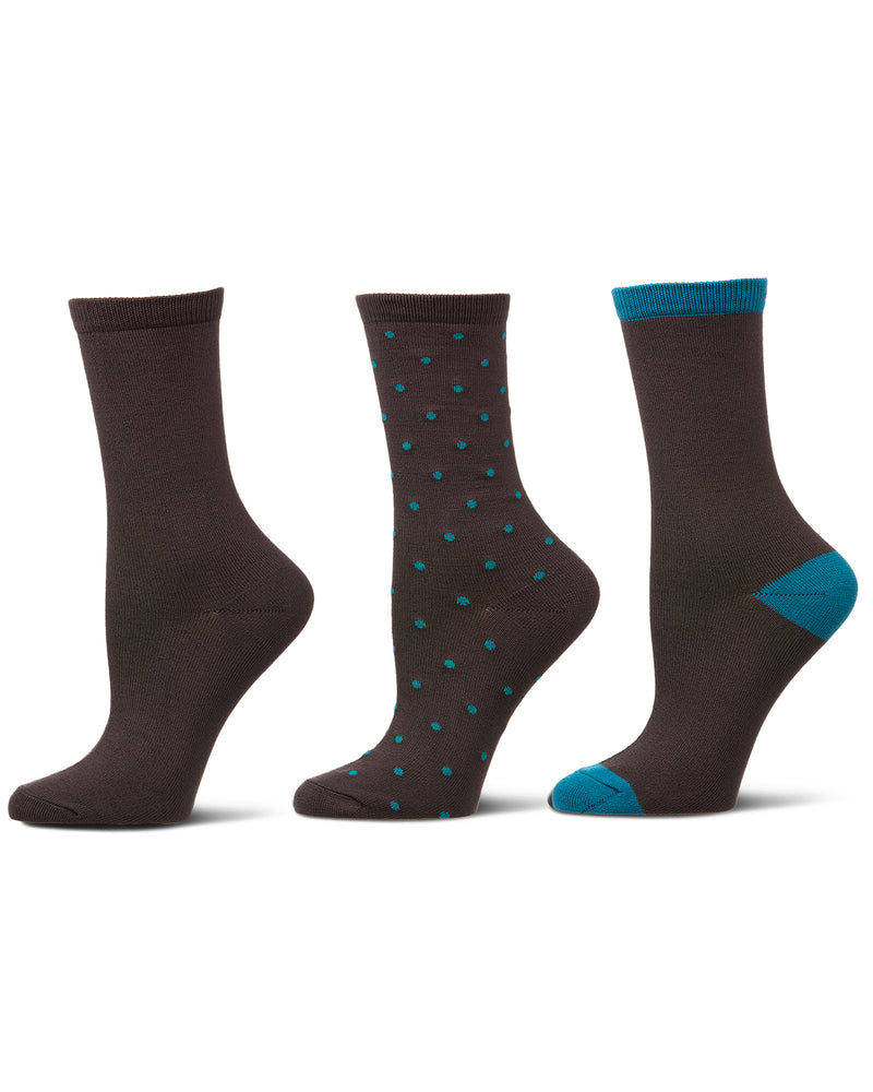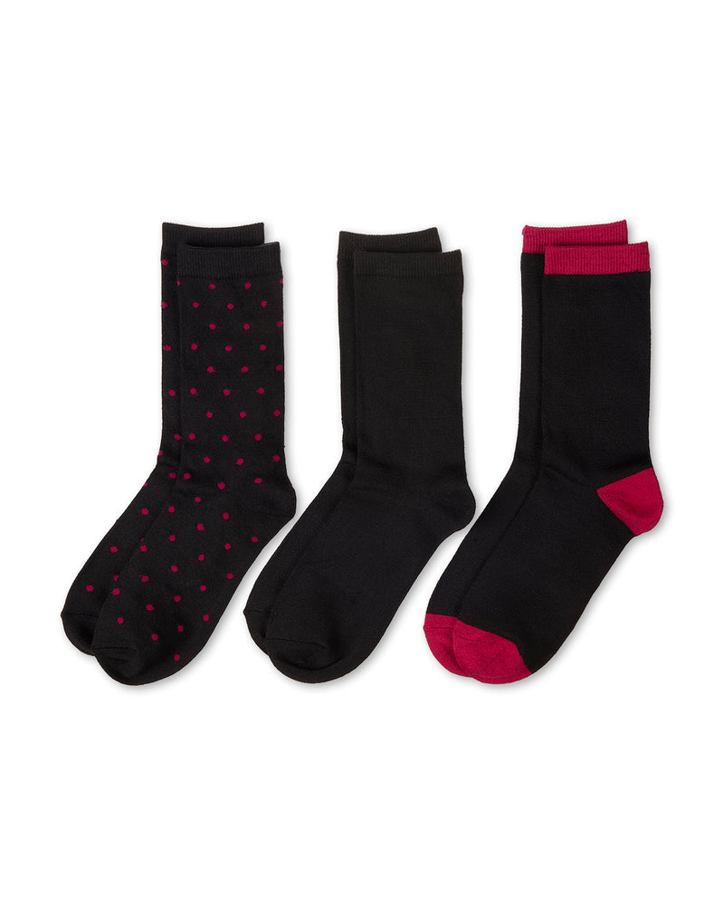 Enjoy blissful all-day comfort with these buttery-soft women's socks. Each convenient 3-pack provides 3 premium pairs of elegant fine-gauge socks, all carefully crafted with luxe moisture-wicking yarns. One pair has cute knit-in polka dots. Another boasts chic contrast trim. And the third is solid all over. Great gift or stocking stuffer.
