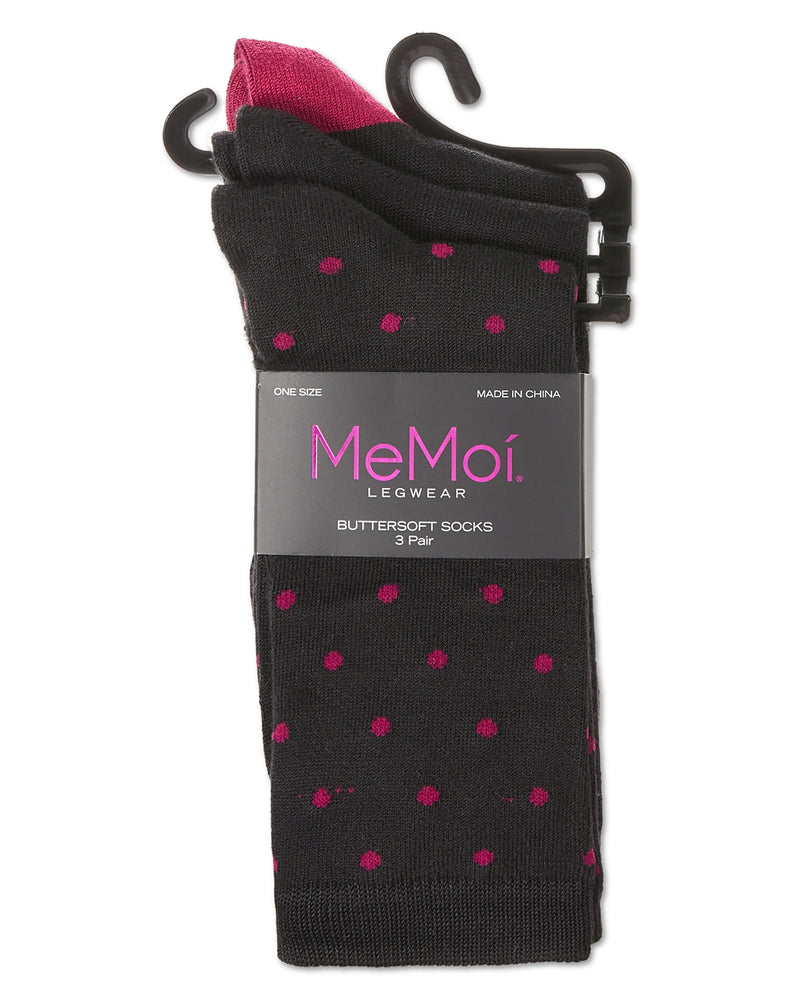 3 Pairs Women's ButterSoft Polytam Polka Dot and Solid Colors Crew Socks
