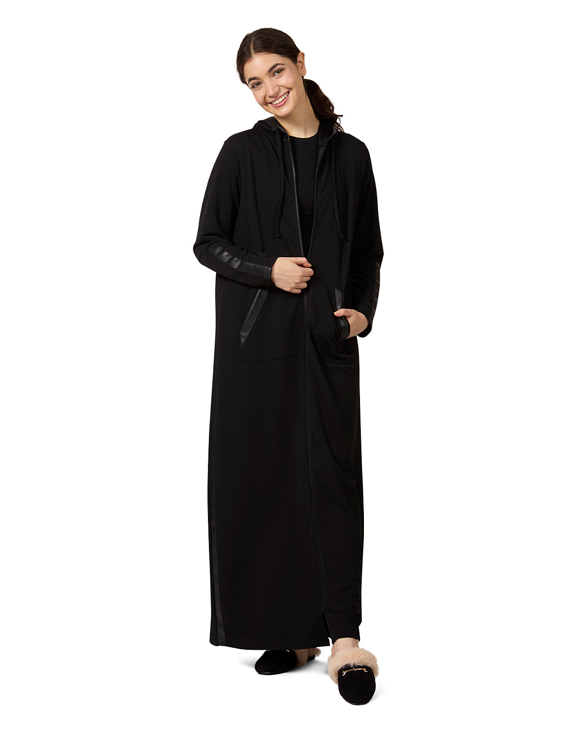 Ready for serious lounging? Slip into this stylish robe. It comes in a luxe fabric blend for softness and breathable comfort. It has a cute drawcord hood for cozy warmth, front slash pockets for handy storage, a chunky full zipper for easy on/off, and a side slit for ease of movement. Finishing touch? Chic vegan-leather trim.
